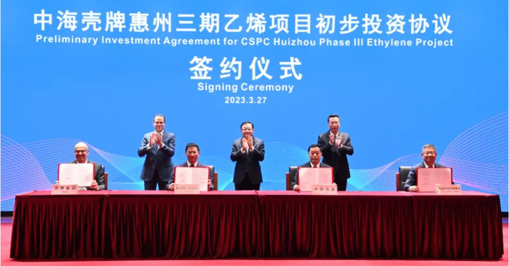 3月27日,中海壳牌惠州三期乙烯项目初步投资协议签约仪式在北京中国海油大厦举行。广东省省委副书记、省长王伟中,中国海油董事长汪东进,壳牌集团首席执行官魏斯旺等出席活动。